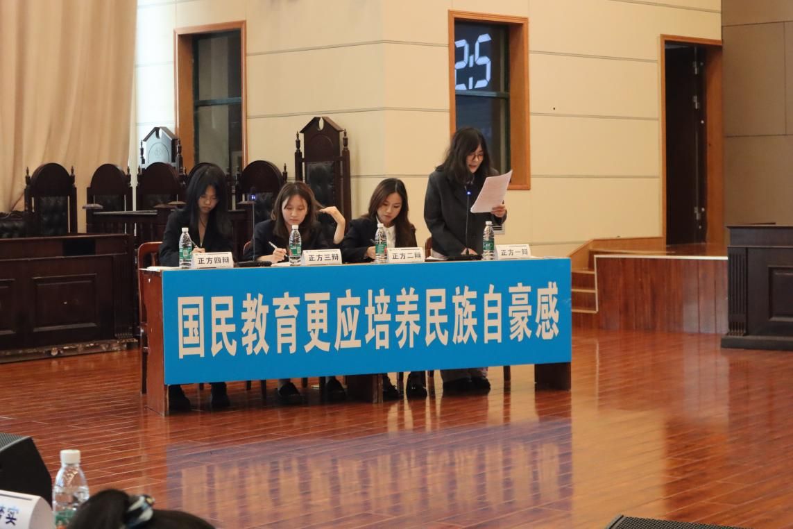 赛事第二项,“菁英杯”国家安全主题辩论赛正式开始。本场比赛正方队伍为中韩新媒体辩论队,辩题为“国民教育更应该培养民族自豪感”;反方队伍为金融学院辩论队,辩题为“国民教育更应该培养民族危机感”。在辩论过程中,正方辩手从多个角度阐述了培养民族自豪感的重要性。正方认为民族自豪感是一个民族的凝聚力和向心力的重要源泉,能够激发人们的爱国热情,促进国家的团结和稳定,当代中国具备了培养民族自豪感的绝佳环境条件,在国民教育中侧重培养民族自豪感有利于树立民族自信心,进而推动国家进步。