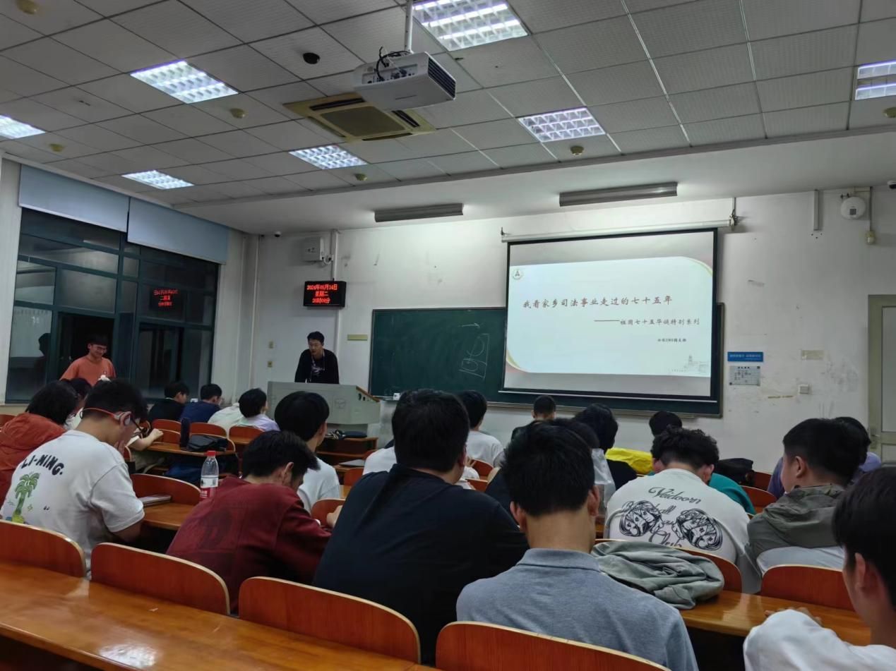 活动第四项,为迎接新中国75华诞,公安2301红旗团支部特别开展了“我看家乡司法事业走过的七十五周年”专题系列活动。团支部成员张源桐同学结合自身经历,向大家生动地讲述了家乡山东七十余载司法建设的变革故事。在他讲述的过程中,听众仿佛置身那些艰苦岁月,深刻地感受到司法事业发展的曲折与艰难。