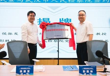 中南财经政法大学党委书记侯振发、武汉市人民检察院党组书记、检察长彭胜坤共同为检校双方共建“金融犯罪刑事检察研究基地”揭牌