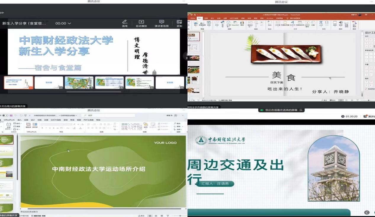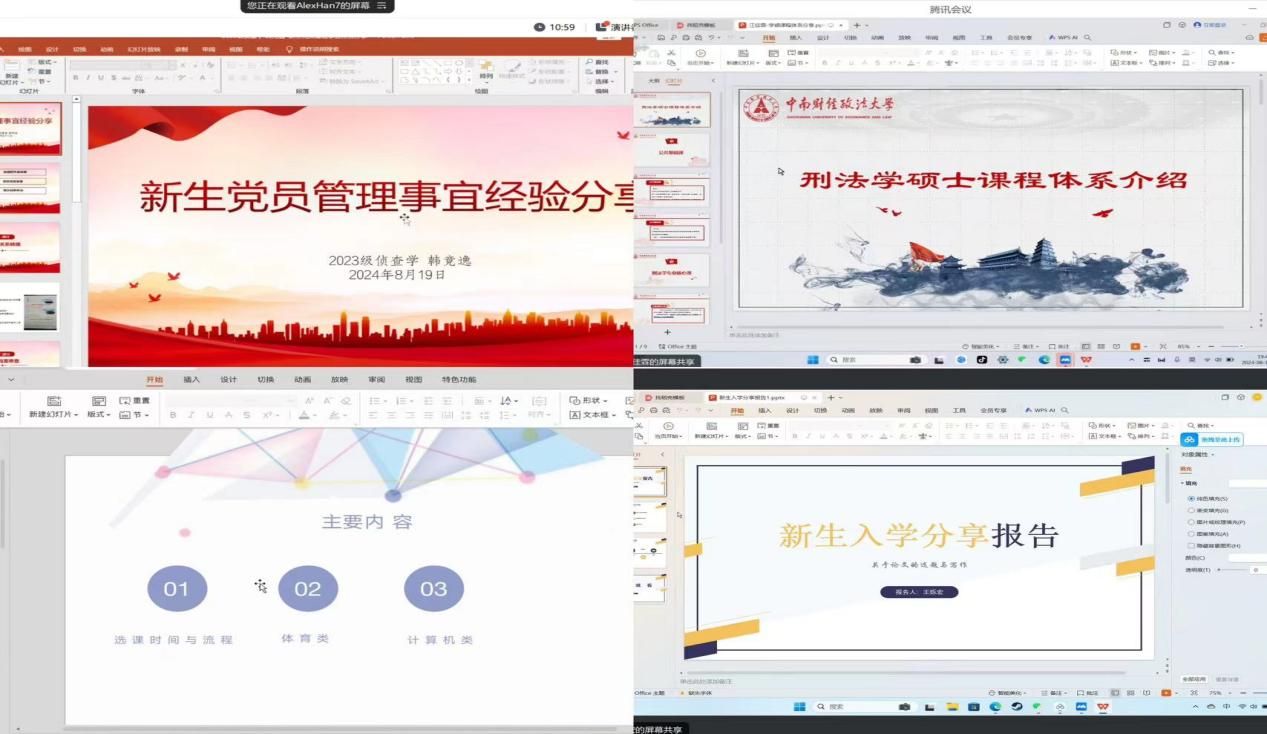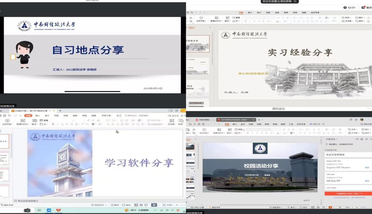 会议伊始,蚁俊彦同学就导师选择、选课分班和奖学金政策进行分享,同时向新生们介绍了学院研究生会以及班委和支委的各项职务;韩竞逸同学从组织关系转接、档案审查和材料补办等角度,为党员管理事宜提供详尽指导;江佳霖同学以刑法学为视角深入解析硕士课程体系;毛诺言同学则为大家展示中南财经政法大学丰富的特色课程。