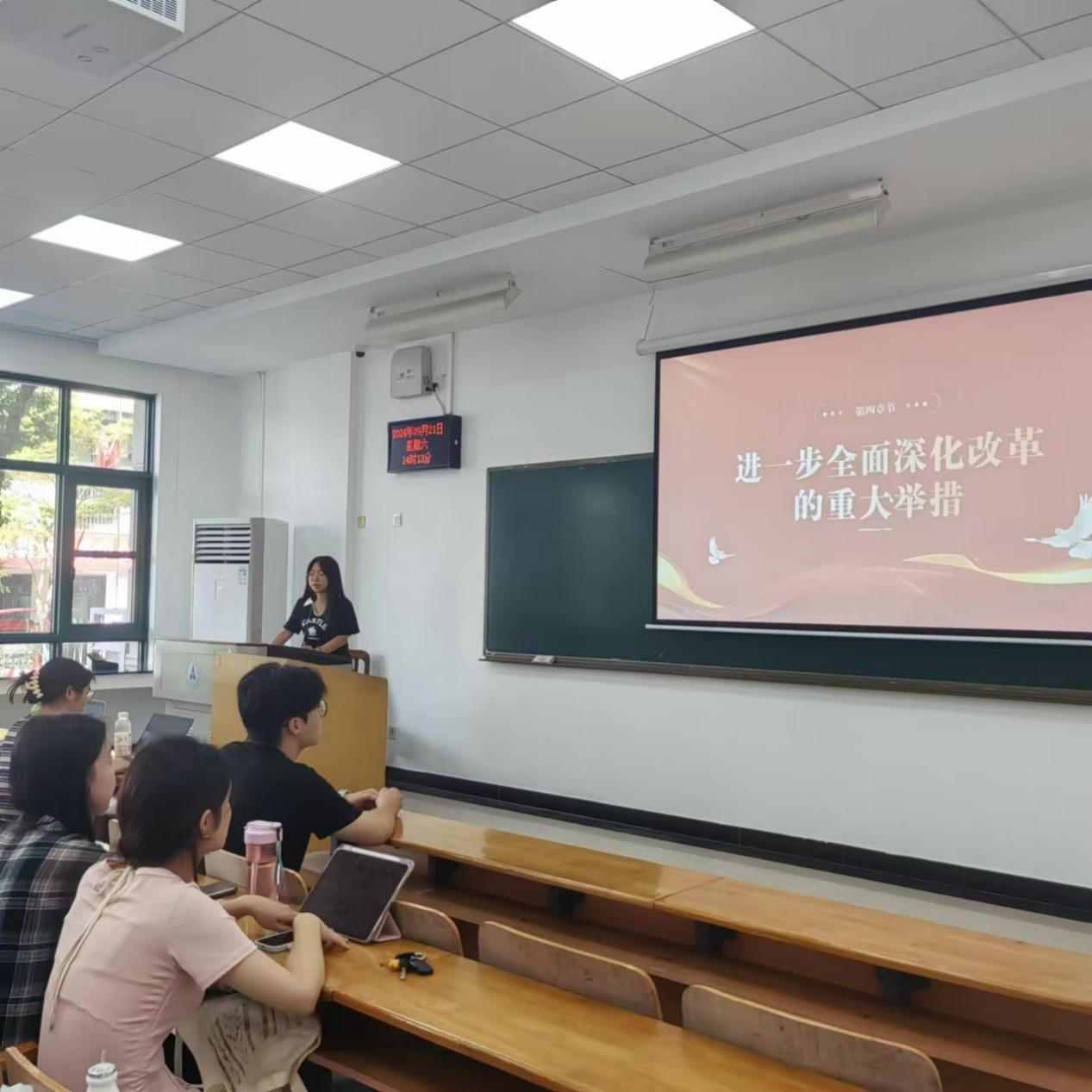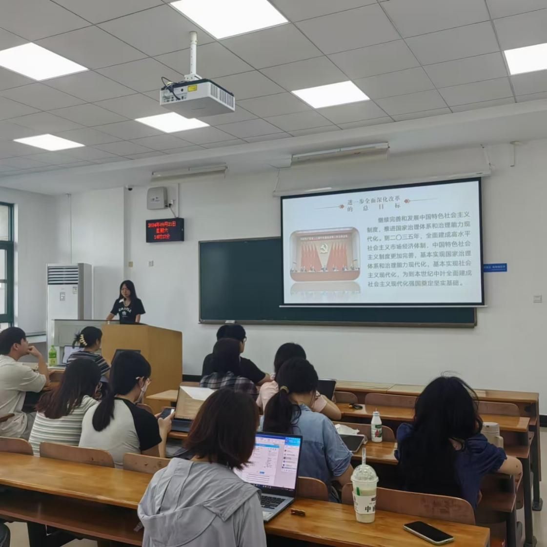 活动中,黄希哲同学详细解读了《中共中央关于进一步全面深化改革、推进中国式现代化的决定》(下文称《决定》)中提出的进一步全面深化改革的总目标——继续完善和发展中国特色社会主义制度,推进国家治理体系和治理能力现代化。进一步全面深化改革聚焦于政治、经济、文化、社会、生态文明、统筹发展、政治保证七个方面,这一目标不仅体现了我们党在改革上道不变、志不改的坚定决心,也为新时代新征程的改革指明了方向。