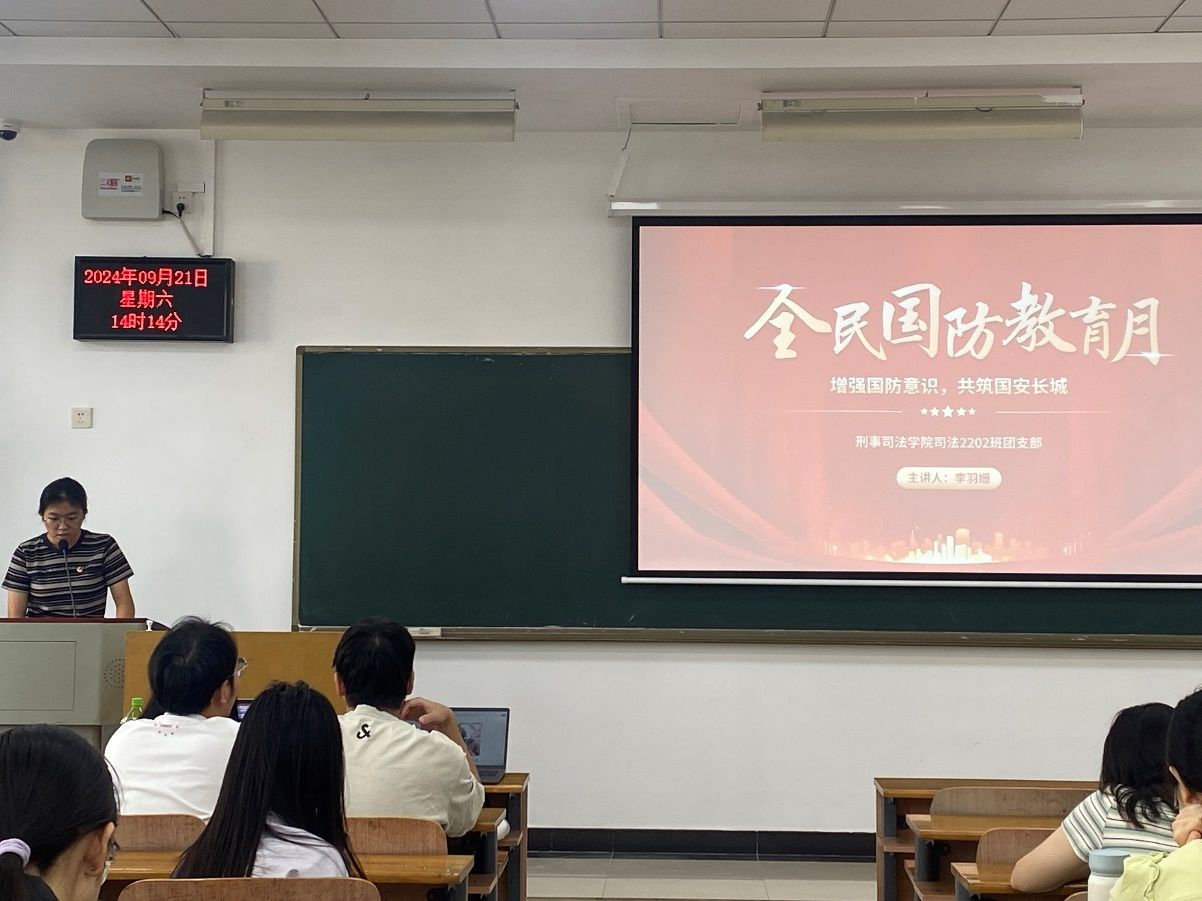 新闻网讯(学生通讯员 李莹)为弘扬爱国主义精神,大力普及国防教育,强化同学们的国防观念,9月21日,刑事司法学院司法2202团支部举办了“增强国防意识,共筑国安长城”主题团日活动,由李羽姗同学主持本次活动。