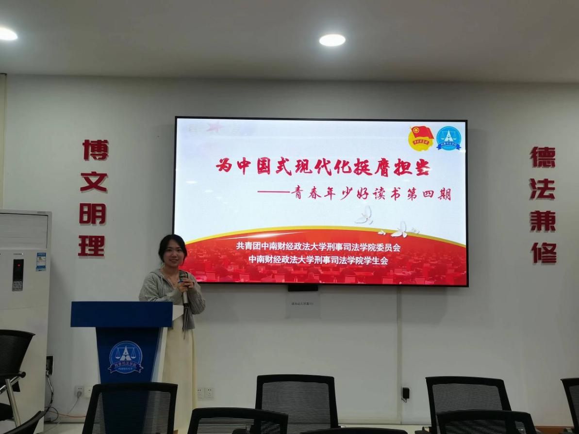 新闻网讯(学生通讯员 石咏和 朱彬彬 岳蕾静)为深入学习贯彻习近平总书记关于青年工作的重要思想,引导广大团员青年爱读书、读好书、善读书,学理论、读经典、促实干。10月10日,刑事司法学院学生会于文治楼二楼会议室举行了“为中国式现代化挺膺担当——青春年少好读书”主题读书季第四期活动。刑事司法学院分团委书记张凡稷、刑事司法学院第二十六届团学组织主要负责人参加本次读书会。