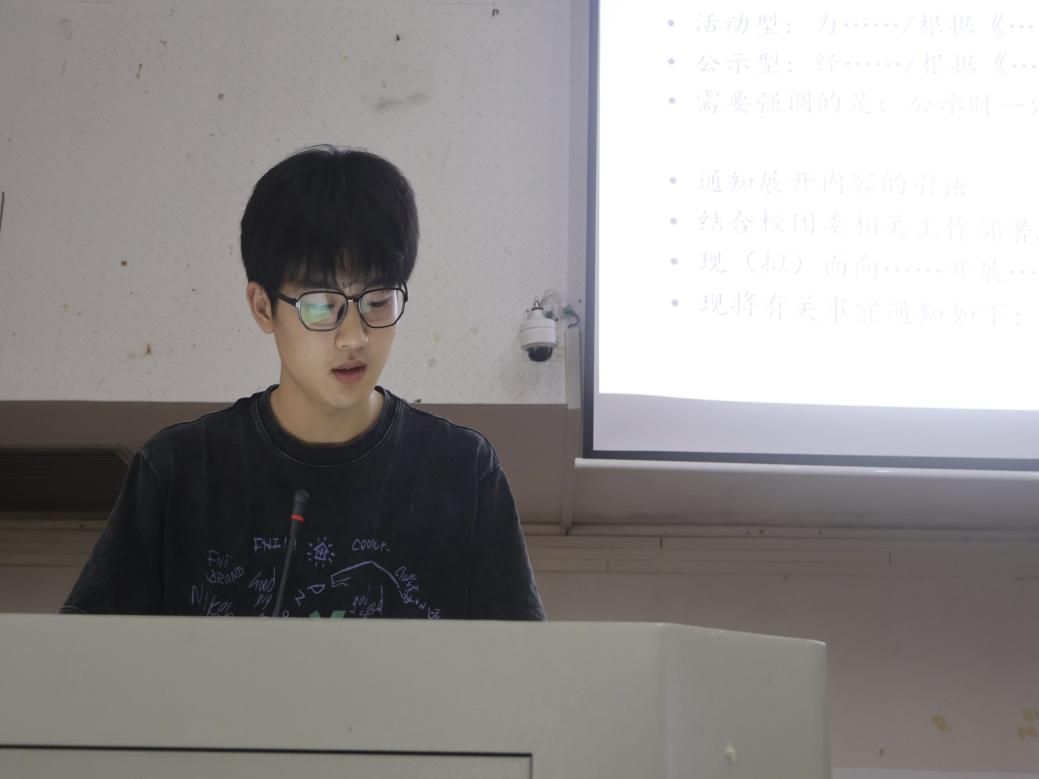 紧接着,新闻办负责人李泽昊聚焦通知拟写这一主题,从通知撰写的六大核心要素出发,条理清晰、深入浅出地阐述了通知拟写的具体要求。他强调,通知作为正式文件,承载着重要的信息传递与组织协调功能,具有极高的公信力。因此,各位负责人在拟写通知时,必须秉持严谨细致的态度,对每一个细节都进行仔细审查,确保通知准确无误。同时,他也呼吁各部门高度重视宣传规范,不断提升自身素养,以便让通知在学院的信息传达与组织协调工作中,充分发挥其桥梁与纽带作用。
