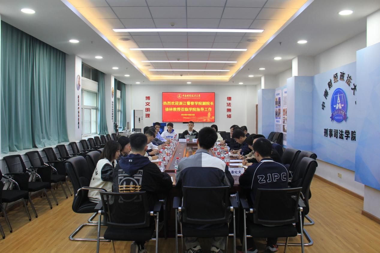 新闻网讯(通讯员 张瀚文)为深化校院交流合作,10月25日下午,浙江警察学院副院长徐林及侦查系副主任张敏一行来我院开展调研座谈。学院党委书记张志刚、副院长董邦俊、党委副书记徐庆祥、党委委员焦俊峰、法庭科学系副主任刘建华、警事科学系副主任徐惠、本科生辅导员张瀚文及浙江警察学院来校交流的12名本科生参会。本次会议由张志刚主持。