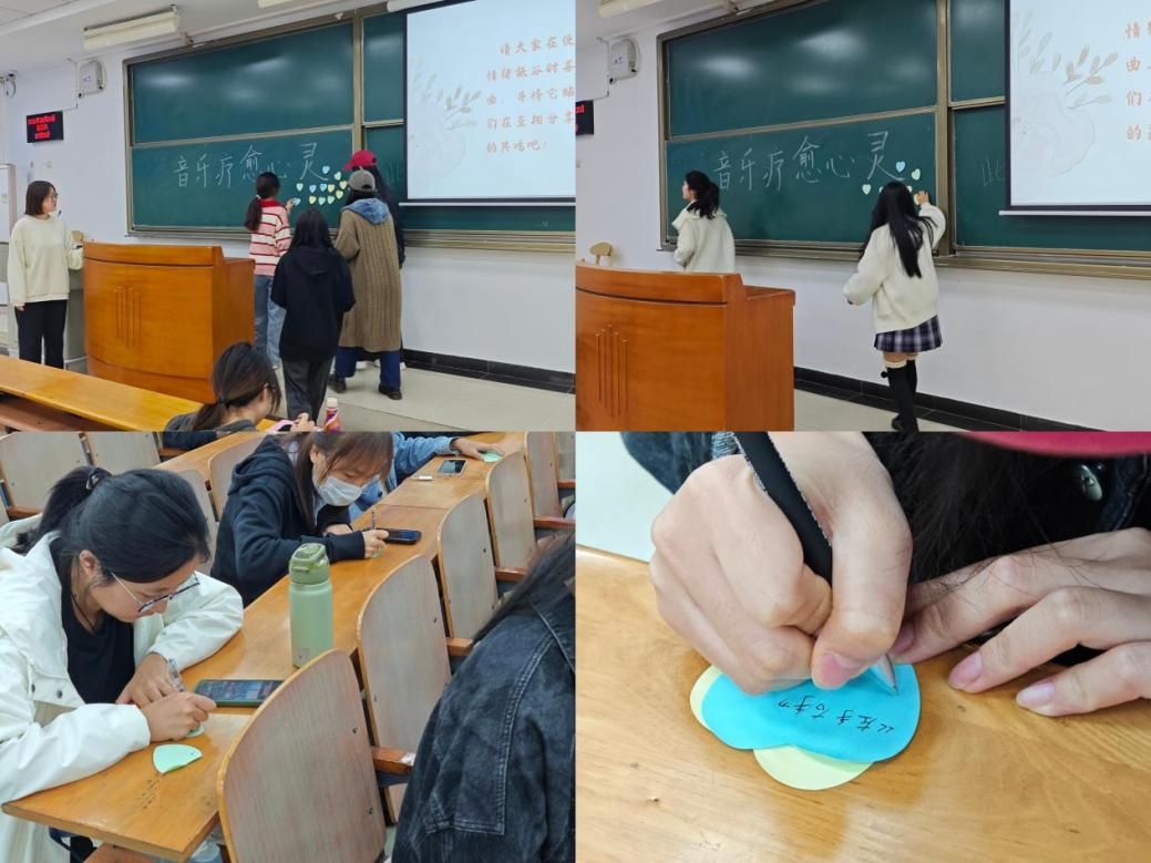 紧接着,到了同学们最喜欢的音乐分享环节,心理委员让大家纷纷在便利贴上写下能够取悦自己的音乐或者歌曲,并将其贴在黑板上。在这种无私的分享中,大家彼此之间发现更多治愈的音乐,找寻到了更多情感的共鸣。