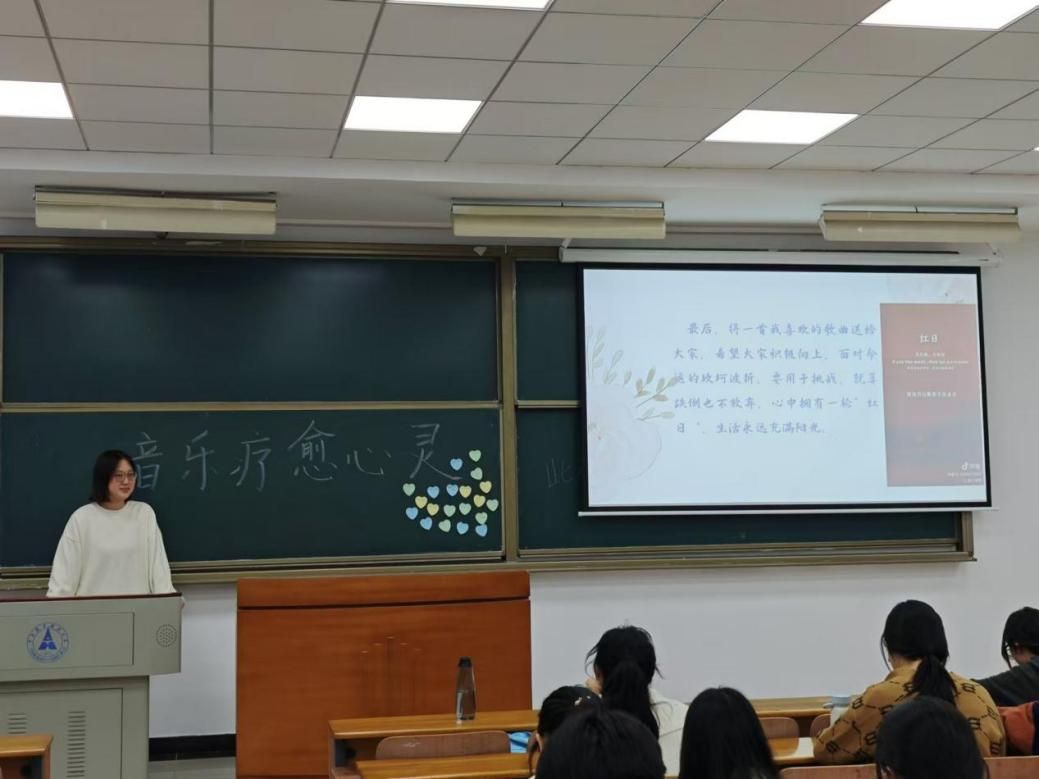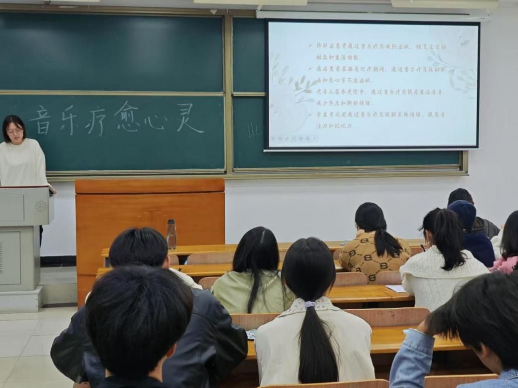 新闻网讯(学生通讯员 程小航)为帮助同学们应对学习生活压力,提高自我调节能力,10月26日下午,司法2202班于文泰楼103教室开展“音乐疗愈心灵”主题心理班会。