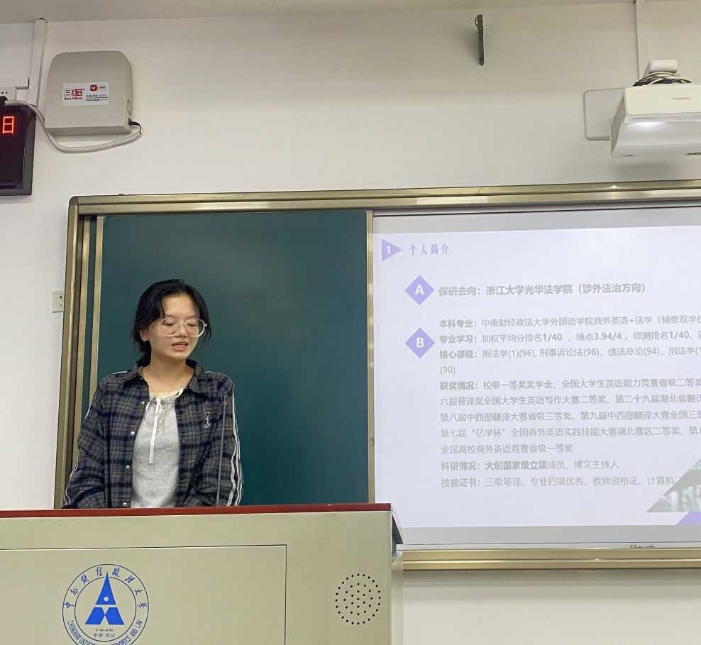 随后,西南政法大学刑法专业考研至中南财经政法大学的刘涵同学分享了她的考研经验。刘涵详细介绍了专业院校选择、备考思路与计划、备考书籍推荐以及笔试面试技巧等方面的内容,为同学们提供了宝贵的参考。她鼓励大家勇敢追求目标,保持理性与勇敢,享受备考过程,顺其自然面对结果。
