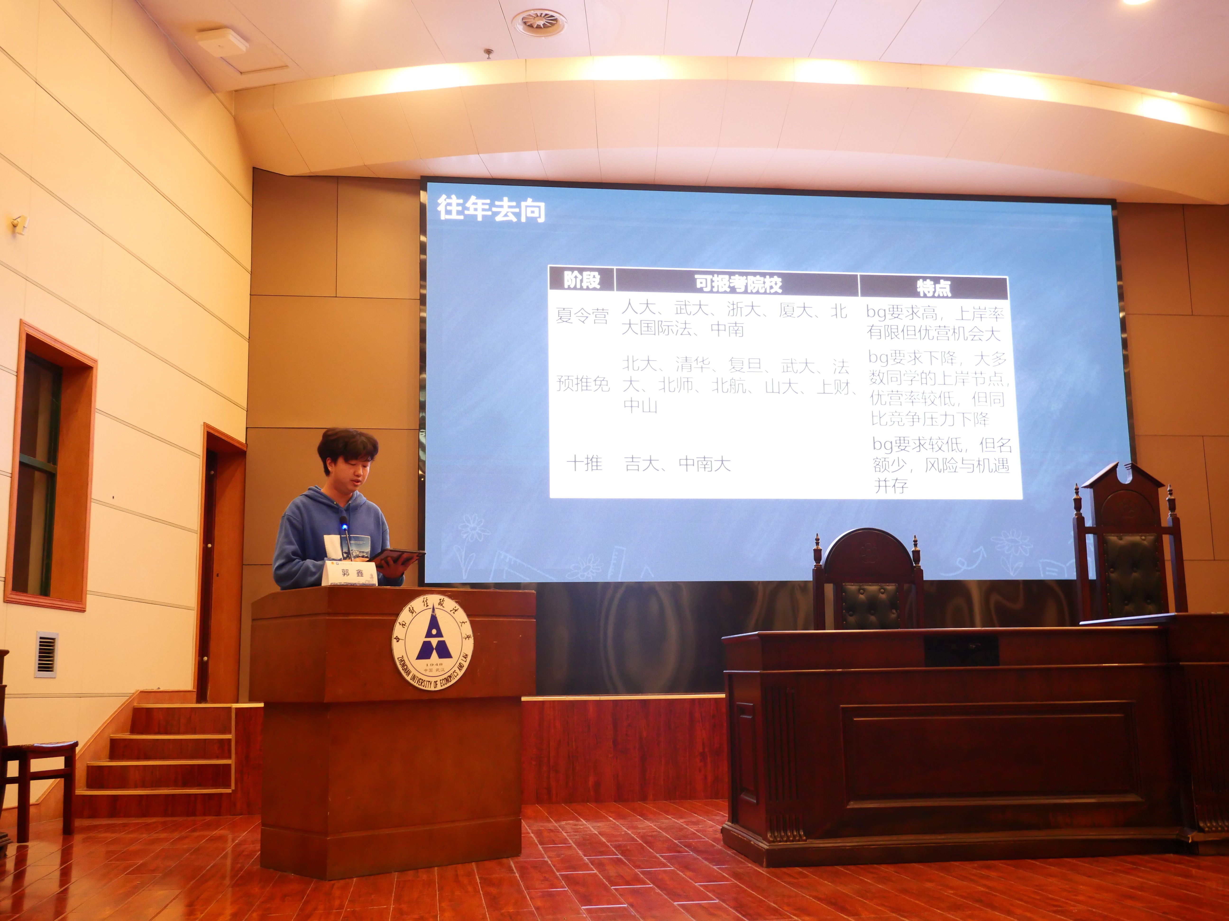新闻网讯(学生通讯员 李佑霖 刘博嵩 徐凌喆)11月14日,中南财经政法大学刑事司法学院“品茗思刑”优秀学生代表保研经验分享会在文泰楼模拟法庭一成功举行,吸引了我院各年级大批有深造意愿的同学参与。本次分享会旨在为同学们提供宝贵的保研经验分享,搭建一个交流与学习的平台,助力同学们在保研之路上稳步前行。