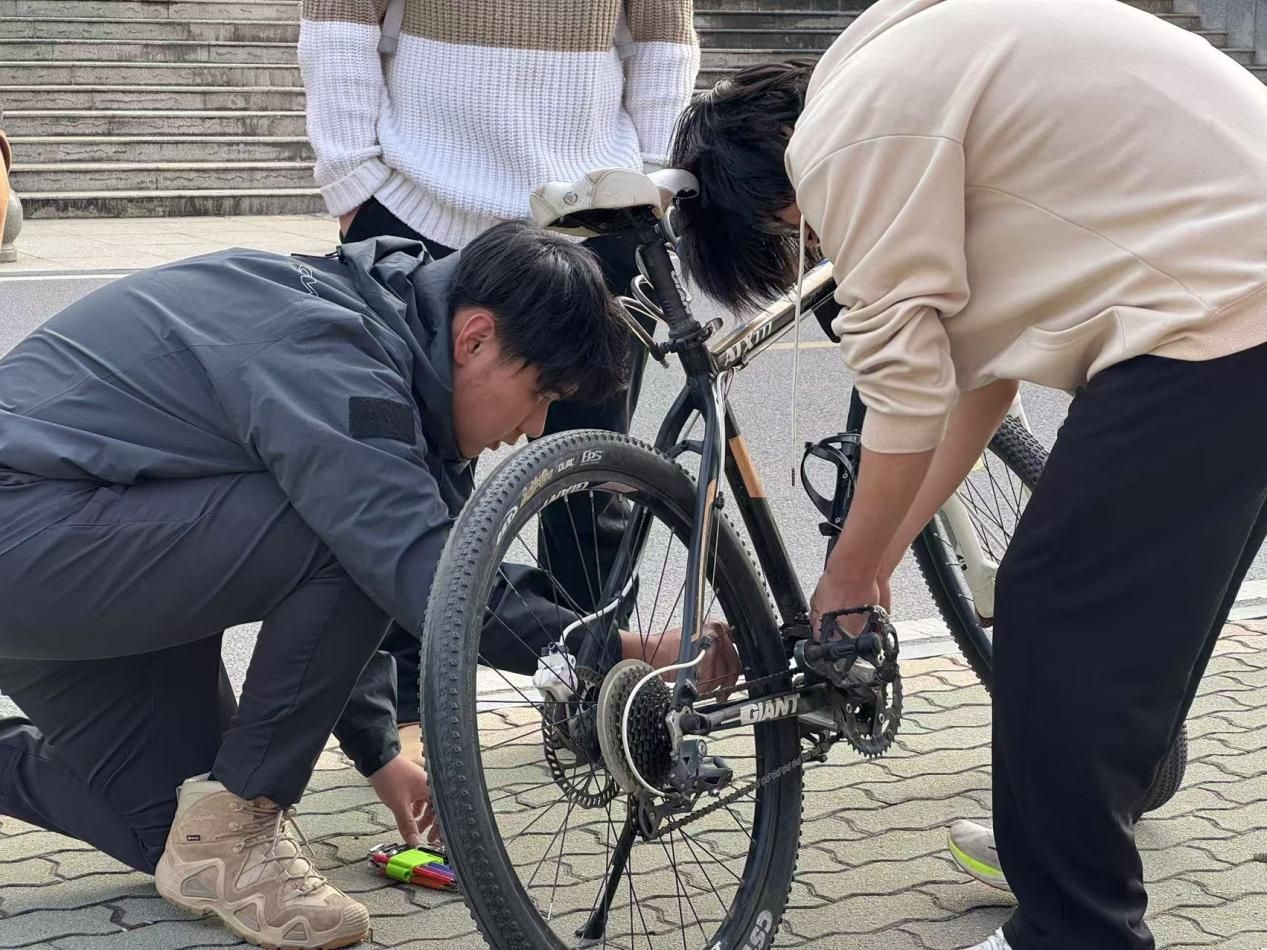 11月21日下午2时30分,活动在五羊广场准时举行。志愿者们早早地搭建好了维修站点,准备好了维修工具和配件。随着师生们陆续到来,维修站点逐渐热闹起来。志愿者们热情接待每一位需要帮助的师生,认真检查每一辆单车,给轮胎充气,润滑链条,调整刹车。在维修过程中,志愿者们还向师生们普及了单车的日常保养知识,例如如何正确使用和保养单车,如何避免常见故障等。这些实用的知识让师生们受益匪浅,也提高了他们对绿色出行的认识。