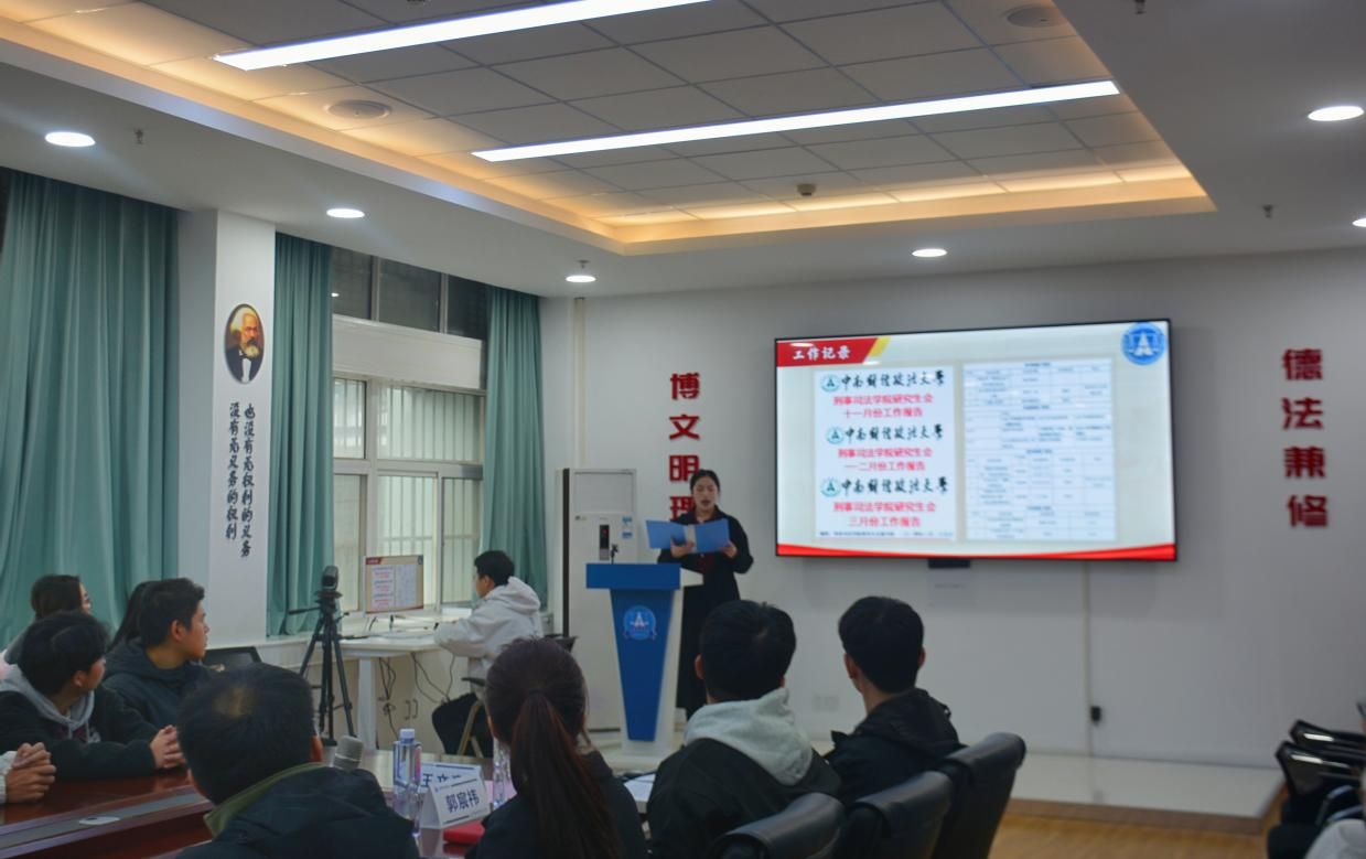 刑事司法学院研究生会执行主席蚁俊彦做学院研究生会工作报告。蚁俊彦从学院研究生会的组织架构切入,详细介绍了学院研究生会的队伍管理模式,为在场学生骨干开展管理工作提供了有益借鉴。随后,她重点介绍了“初心杯”“征程杯”“使命杯”“奋楫杯”等系列活动,展现了刑事司法学院研究生会的良好风貌和工作成效。
