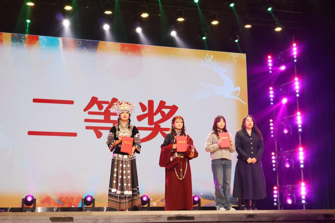 群雄汇聚,决战中南。比赛中,各院选手为观众献上美轮美奂的视听盛宴。在群雄之中,我院选手凭借一曲藏族民歌《次仁拉索》获得了全场的欢呼。嘹亮的歌声空谷传响,绕梁三日而不绝于耳;优美的舞姿,洁白的哈达,将观众的思绪拉向辽远的雪域圣地。节目舞台编排独具匠心,选手们以深厚的功底稳定发挥,他们按照不同的顺序登台,逐步将现场氛围引向高潮。通过选手们的歌舞表演,将歌曲魅力与藏族风情淋漓尽致地展现在大众眼前。最终凭借极富感染力的演唱与精彩绝伦的舞台表现给评委老师及现场观众留下了深刻印象,以优异表现获得了本次大赛的二等奖。