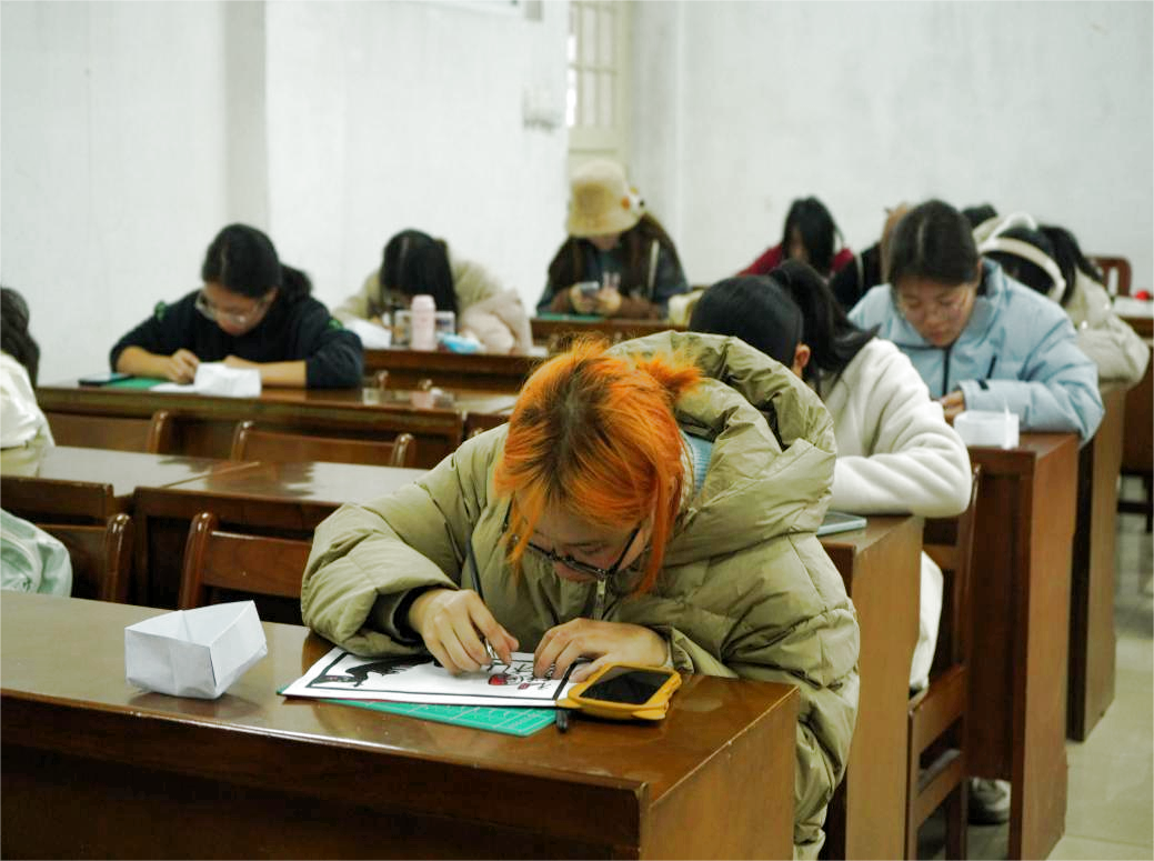 叶逐金刀出,花随玉指新。传统技艺体验室里处处是认真学习的“手艺人”:纸上复胶,笔刀飞舞,同学们手拿工具,时而大刀阔斧,时而精雕细琢,在纸上刻画出一道道律动优美的线条。虽是初学,手法生疏,但稳稳刻下的每一笔,都承载着他们对传统文化的尊重,流露着对非遗艺术的真情。