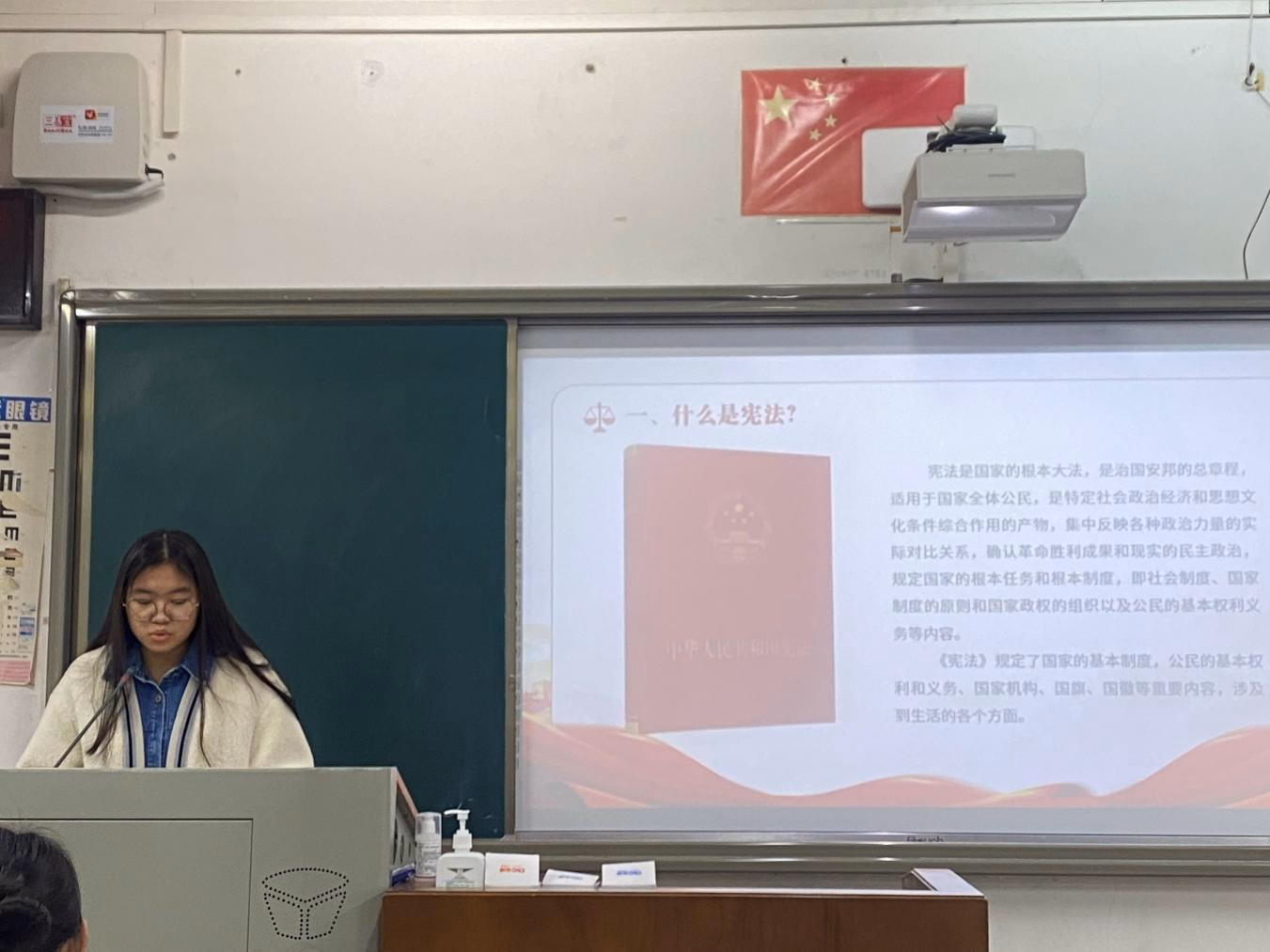 活动伊始,李羽姗同学以“遵法守纪固根本”为主题,从宪法的基本知识、2024年全国宪法周主题解读、构建中国自主的宪法学知识体系、各地宪法宣传掠影四个部分依次展开讲解,帮助同学们深入了解宪法,学习宪法。