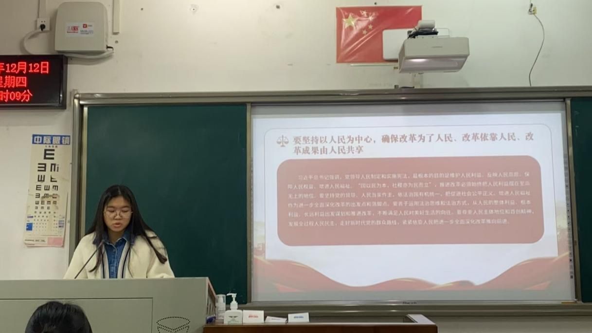 第三部分,李羽姗结合班级专业特色,带领同学们一同学习相关重要论述,梳理了知识框架,增强了法学专业学生对宪法的认同。
