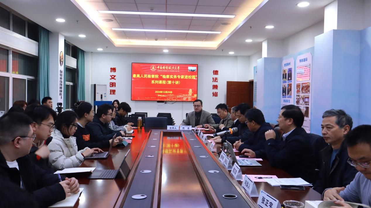 新闻网讯(学生通讯员 杨晨宇 摄影 肖思言)12月26日晚,最高人民检察院“检察实务专家进校园”系列课程第十讲在中南财经政法大学文治楼2楼会议室举行,由最高人民检察院刑事执行检察厅副厅长、一级高级检察官、全国检察业务专家刘福谦同志讲授。湖北省人民检察院第十一检察部主任高鹏、湖北省人民检察院第五检察部副主任杨胜春,湖北省人民检察院干警陈璐、曾春伟,刑事司法学院党委书记张志刚、副院长董邦俊教授,魏汉涛教授、张正宇副教授出席讲座,刑事司法学院众多本科生、硕士生、博士生到场参会。刑事司法学院副院长周凌教授主持本次讲座。