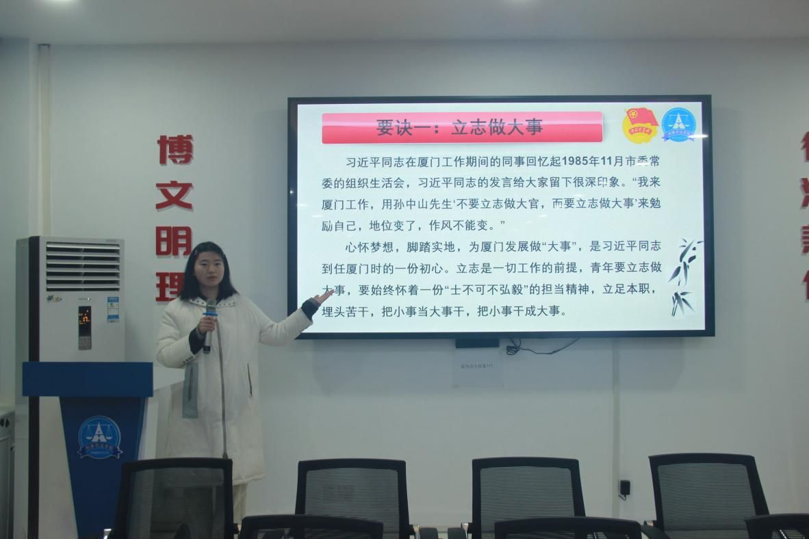 活动第二项,由院学生会主席团成员黄希哲带领大家学习《习近平在厦门》一书的主要内容。黄希哲同学指出,青年时期需立大志而披荆斩棘,肯吃苦而攻坚克难,谋长远而造福民众。广大青年更应当树立梦想,努力学习,为青春远航积蓄能量,着眼于长远,甘做铺垫之事,敢抓未成之功。