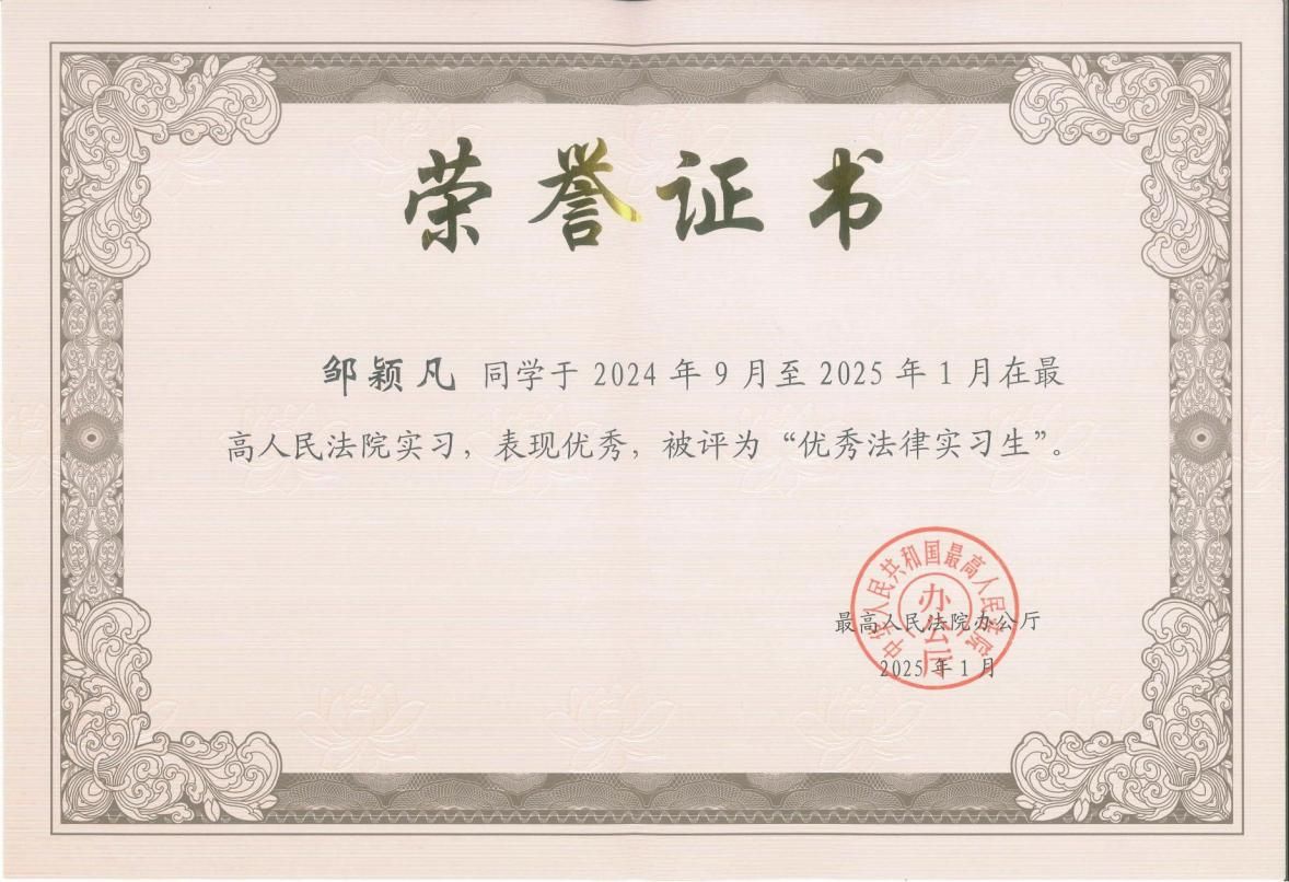 2024年9月,经我院推荐、学校选拔、最高人民法院考察,2023级刑法学专业硕士研究生邹颖凡入选最高人民法院第十五批法律实习生,2024年9月至2025年1月于最高人民法院刑事审判第一庭实习。日前,为表彰实习期间表现优秀的法律实习生,经各实习单位严格选拔推荐,最高人民法院政治部、机关党委共同研究审核,我院2023级刑法学硕士生邹颖凡同学荣获最高人民法院第十五批“优秀法律实习生”称号。据悉,本批来自全国法律院校实习生共75名,其中32名获得“优秀法律实习生”荣誉称号。
