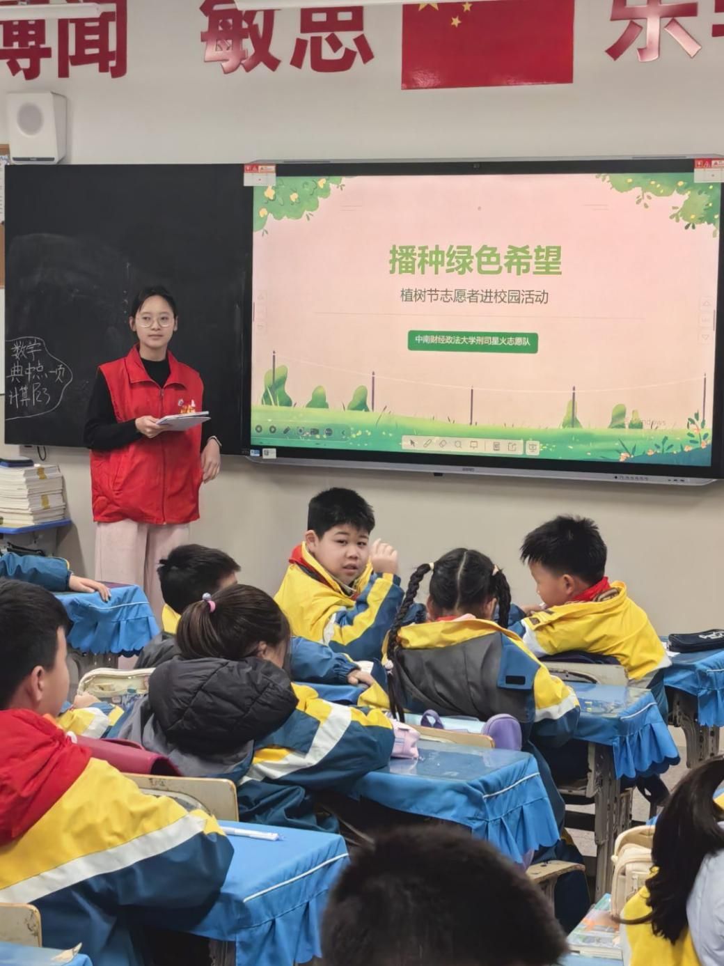 新闻网讯(学生通讯员 易和越 梅瑞德)春和景明万物生,植绿护绿正当时。3月13日,中南财经政法大学刑事司法学院星火志愿队走进武汉光谷第五小学,以"守护绿色未来,共建生态家园"为主题,为小学生们带来一堂知识科普与劳动实践相结合的生态文明课。