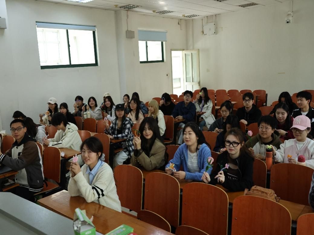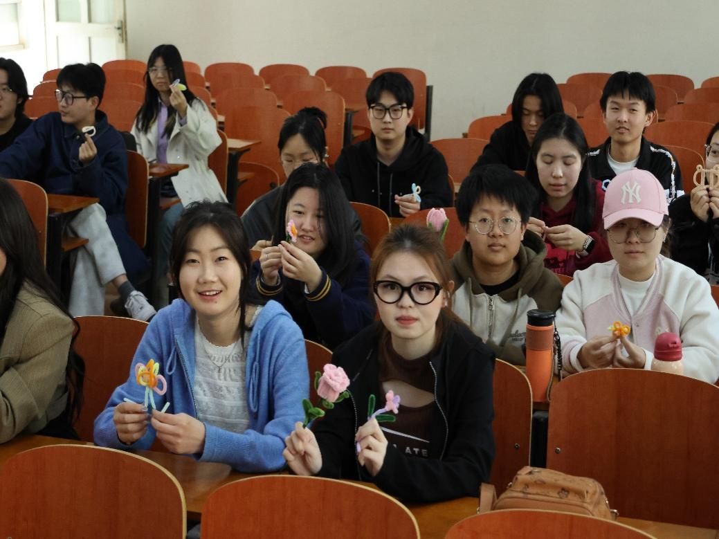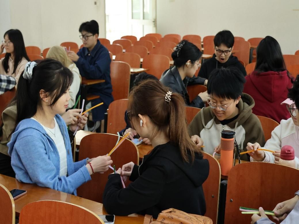 活动伊始,陈亚萍同学指出:劳育是“五育”的重要一环,希望同学们在动手实践中发现美、创造美,体验美。随后同学们以小组为单位领取了五颜六色的扭扭棒、珠子、丝带等材料,活动现场欢声笑语,大家互相分享制作技巧,专心致志创作,一扭一折间,平凡的材料被赋予艺术生命力。