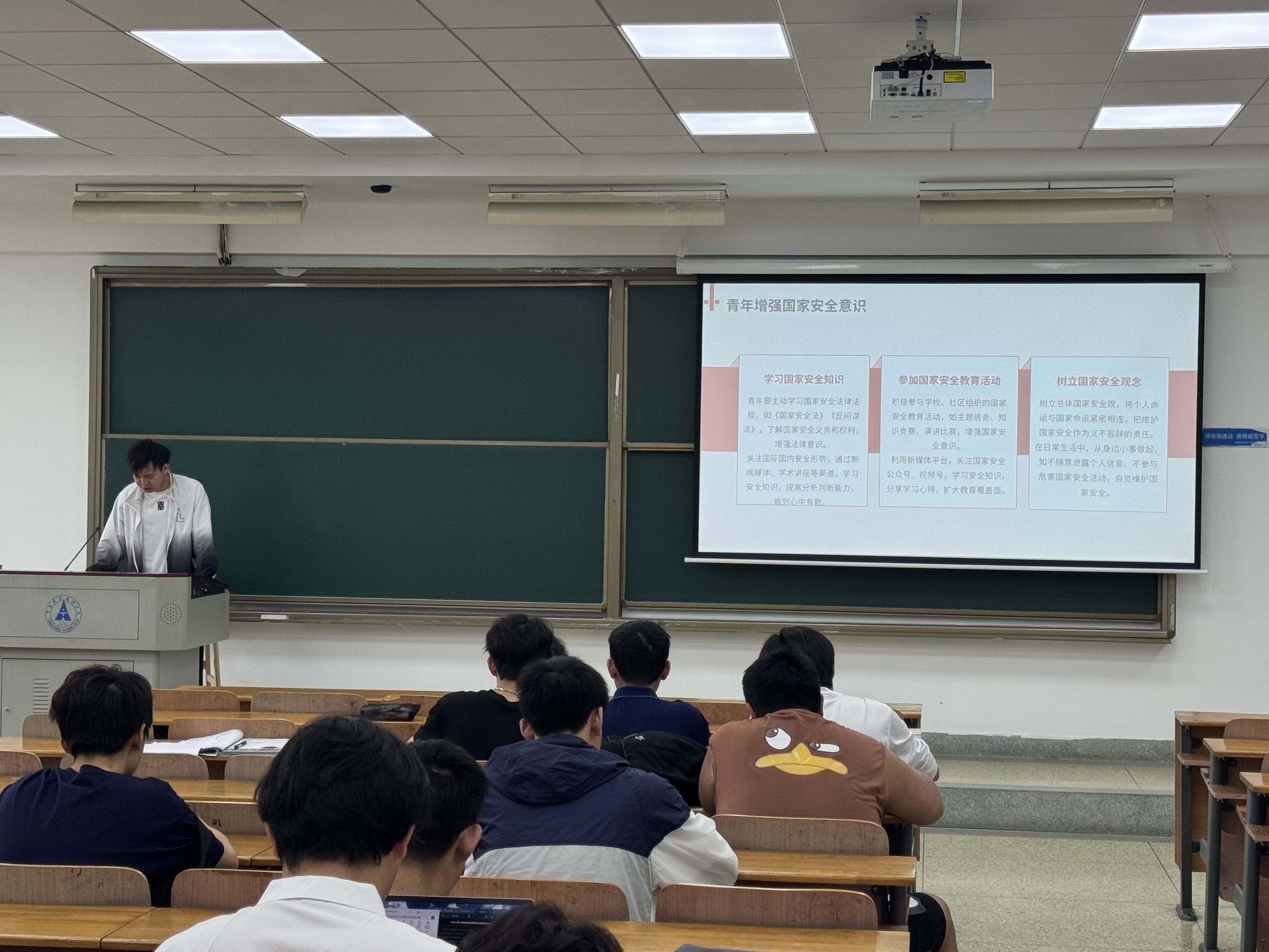 在互动分享环节,多位同学踊跃发言。有的同学结合专业知识,提出在公安工作中维护国家安全的具体举措;有的同学从日常生活出发,倡议大家从身边小事做起,警惕危害国家安全的行为。最后,团支书对班会进行总结,呼吁全体同学将维护国家安全的责任内化于心、外化于行,在学习和生活中时刻保持警惕,为守护国家安全贡献青春力量。?