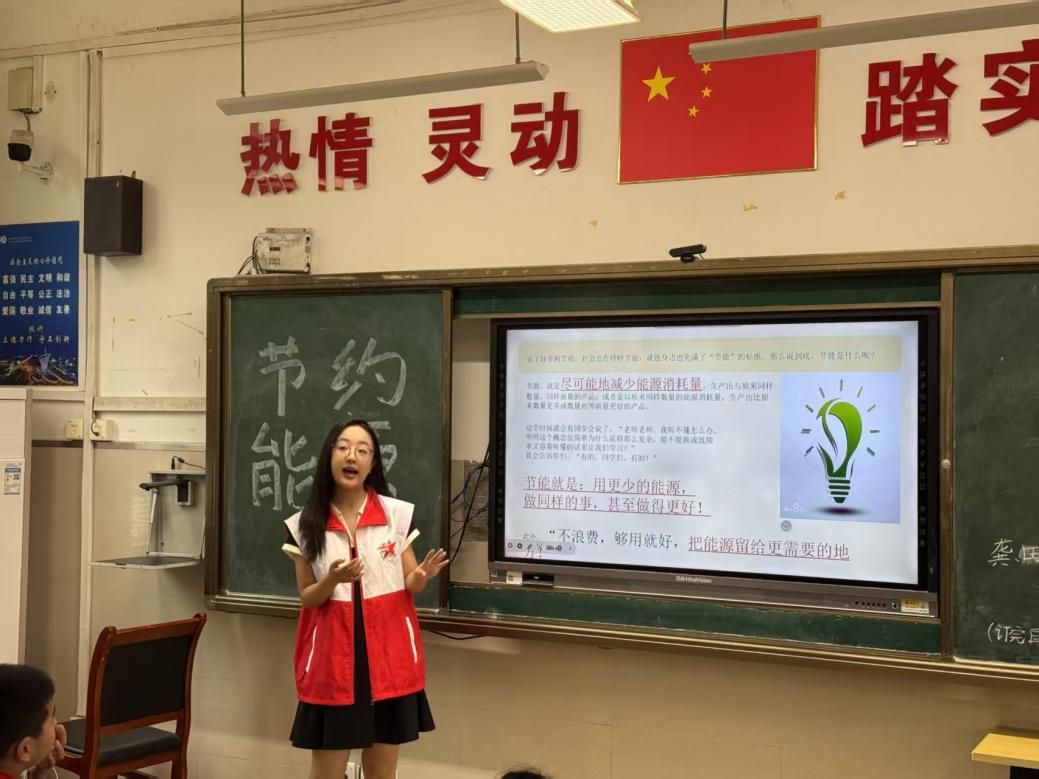 活动伊始,志愿者以生活中的节能标语为切入点,引导同学们思考人类为什么要节约能源,让同学们意识到能源的严重性,激发学生节约能源的意识,进而更好地投入课堂。