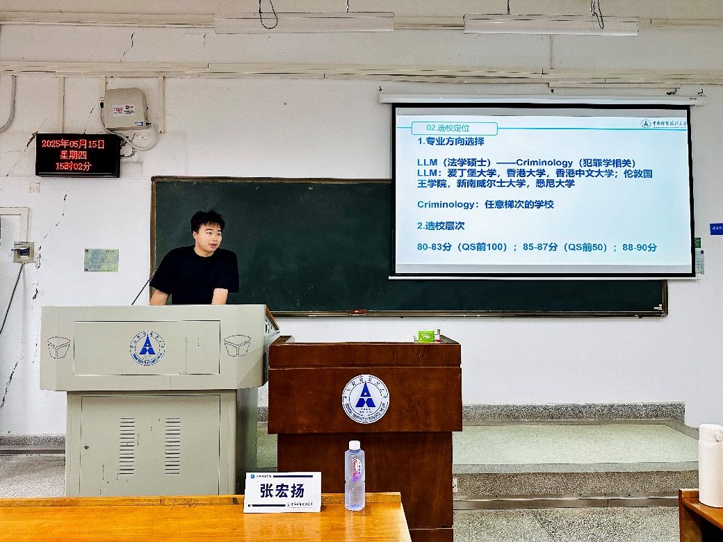 本次活动特邀我院2021级侦查学专业本科生张弘扬同学作为主讲嘉宾,围绕“留学申请经验与学术规划心得”进行主题分享。张弘扬同学不仅在学术领域表现亮眼——曾两度在《中国刑警学院学报》公开发表论文、主持省级大学生创新创业项目,更在竞赛实习中崭露头角。他目前手握剑桥大学、伦敦政治经济学院、爱丁堡大学三所世界名校的录取资格,并即将奔赴剑桥大学攻读犯罪学研究生。