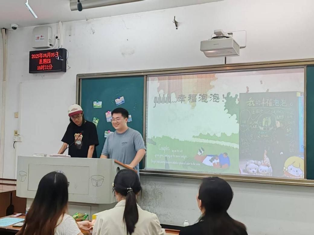 心理班会由一个趣味破冰小活动“抓手指”开始,大家在欢声笑语中迅速完成了破冰任务,将活动气氛推向了高潮。随后进入绘画幸福泡泡环节,同学们四到五人为一组,将自己认为幸福的事写在一个个泡泡里,看日落,听演唱会,旅行,摸小猫和小狗等等,同学们上台分享着这些让自己幸福的故事,这些幸福的片段也激起了大家对生活的热情。