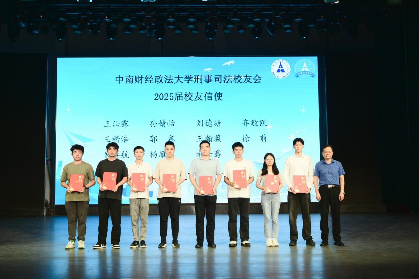 学院党委书记张志刚在大会现场宣读了中南财经政法大学刑事司法校友会2025届校友信使名单,并鼓励他们成为母校与校友间的“桥梁纽带”,传递学院关怀,凝聚校友力量,共同书写刑司人的奋进篇章。刑事司法校友会会长胡向阳教授为校友信使颁发聘书。